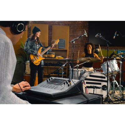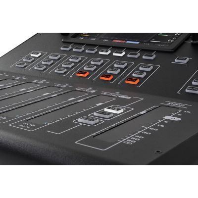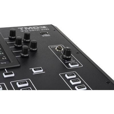 Der TMD16 wurde speziell entwickelt, um ohne tiefgehende Audioengineering-Kenntnisse sofort einsatzbereit zu sein. Mit beleuchteten Drucktastern, 10 dedizierten Push-Encodern und 100 mm kapazitiven Touch-Fadern bietet das Mischpult eine durchdachte Benutzeroberfläche mit direktem Zugriff auf alle Funktionen – ganz ohne Menü-Suchen oder externe Steuergeräte.