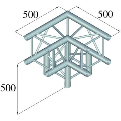 Die 3-Wege-Ausführung dieser Ecke erlaubt die Verbindung von drei Traversen im rechten Winkel zueinander – ideal für Rahmenkonstruktionen, Decken- oder Wandtraversen sowie Traversenwürfel. Mit Außenmaßen von 50 x 50 x 50 cm bietet sie kompakte Abmessungen bei gleichzeitig hoher Tragkraft. Der Lochmittenabstand von 240 mm sorgt für perfekte Kompatibilität im System.