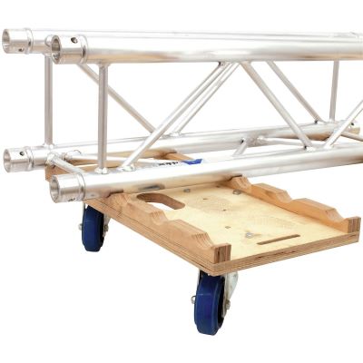 Die beiden mitgelieferten Trusstransport-Wagen bestehen aus robustem Multiplex-Holz und sind speziell für QUADLOCK- und TRILOCK-Traversen mit 290 mm Außenmaß konzipiert. In Kombination mit den 8 Stapelleisten lassen sich bis zu 12 Traversen sicher und übersichtlich stapeln und bewegen.