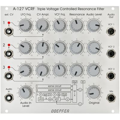 Doepfer A-127 VC ist eine hoch flexible dreifache Resonanzfilter-Einheit aus drei getrennten Bandpässen. Sie eignet sich beispielsweise zur Nachbildung von Resonanzen aus feststehenden Frequenzen. Es können auch sprachähnliche Effekte und Vocoder Effekte erzielt werden.