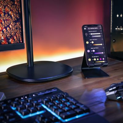 Light Strip ist dünn, zuschneidbar und dank der tesa-Rückseite extrem haftfähig, sodass eine Befestigung auf fast jeder festen Oberfläche möglich ist. Stelle die Helligkeit mit der Maus ein. Mit einem Tippen auf dem Smartphone schaffst du die perfekte Atmosphäre. Mit deinem iPhone oder Android-Gerät kannst du somit Light Strip überall in deinem Studio steuern.
