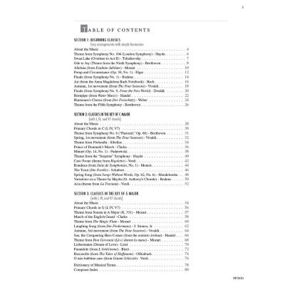 In diesem Band finden sich eingängige Themen aus Opern, Sinfonien und Solostücken – beispielsweise Finlandia von Sibelius, Die Forelle von Schubert oder Liebestraum von Liszt. Die Stücke wurden so arrangiert, dass sie für Anfänger gut spielbar sind, dabei aber musikalisch authentisch bleiben. Viele Titel sind zudem mit optionalen Begleitstimmen versehen und fördern das Zusammenspiel mit Lehrkräften oder Mitspielern.