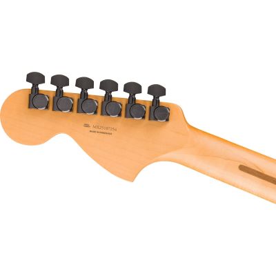 Der Korpus aus Erle mit glänzendem Polyester-Finish liefert den typischen, ausgewogenen Fender-Sound mit klaren Höhen, fokussierten Mitten und straffem Bass. Die Stratocaster®-Form sorgt für komfortables Handling, während das 3-lagige schwarze Schlagbrett und schwarze Hardware stylische Akzente setzen.