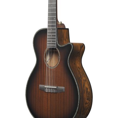 Die massive Sapele-Decke liefert einen warmen, ausgewogenen Ton mit klarer Ansprache – ideal für Fingerstyle, klassische Stücke oder moderne Nylon-Klänge. Boden und Zargen aus Bocote verleihen der Gitarre nicht nur eine außergewöhnlich schöne Maserung, sondern auch zusätzliche Tiefe und Projektion im Klang. Der Nyatoh-Hals in Kombination mit dem Macassar-Ebenholz-Griffbrett sorgt für ein angenehmes Spielgefühl und ein stabiles Sustain.