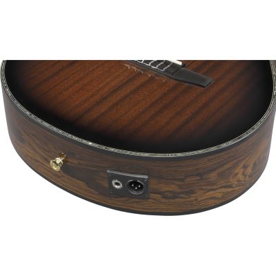 Die Abalone-Rosette und das Abalone-Purfling setzen edle Akzente und unterstreichen den hochwertigen Gesamteindruck der Gitarre. Weiße Dot-Inlays auf dem Griffbrett erleichtern die Orientierung, während der hochglänzende Mahogany Sunburst-Finish der Gitarre eine klassische und zugleich moderne Optik verleiht. Die vergoldeten Classical-Mechaniken runden das stilvolle Erscheinungsbild ab und bieten zuverlässige Stimmstabilität.