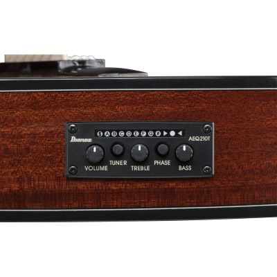 Mit dem Ibanez Undersaddle Tonabnehmer und dem AEQ210T Preamp ist die Gitarre bestens für den Live-Einsatz gerüstet. Der Preamp verfügt über ein 2-Band-EQ zur Klangformung und ein integriertes Stimmgerät mit gut ablesbarem Display – ideal für spontane Auftritte oder Proben ohne zusätzliches Tuner-Equipment.