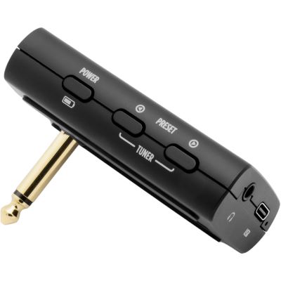Über den integrierten 1/4"-Gitarreneingang (TS, schwenkbar) wird die Gitarre angeschlossen, während ein 1/8"-Stereoausgang für Kopfhörer oder externe Geräte zur Verfügung steht. Die Bedienung erfolgt über seitliche Funktionstasten (Up/Down, +/-, Power), mit denen sich durch Presets und Einstellungen navigieren lässt. Zusätzlich sorgen Front-RGB-LEDs für optisches Feedback, z. B. beim Laden oder zur Darstellung des aktuellen Modus.