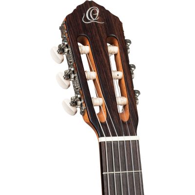 Der Hals der Gitarre besteht aus afrikanischem Mahagoni und ist bewusst schmaler gestaltet. Mit einer Sattelbreite von 48 mm bietet die Ortega R18SSN 4/4 Konzertgitarre inkl. Gigbag ein besonders komfortables Griffgefühl. Dadurch eignet sich das Instrument ideal für Gitarristen mit kleineren Händen oder für Spieler, die von einer Westerngitarre auf eine Konzertgitarre wechseln.