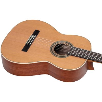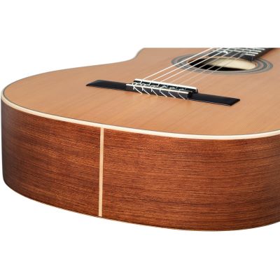 Dank der massiven Zederndecke profitieren Sie von einem warmen, ausdrucksstarken Klang mit schneller Ansprache. Die Kombination mit Bubinga sorgt für zusätzliche Tiefe und Klarheit, wodurch ein ausgewogenes Klangbild entsteht.
