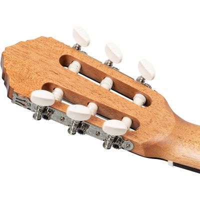 Mit einer klassischen Mensur von 650 mm bietet die Gitarre ein vertrautes Spielgefühl und eine ausgewogene Saitenspannung. Die hochwertigen Chrom-Mechaniken im eleganten Lyra-Design mit weißen Stimmflügeln ermöglichen ein präzises Stimmen und sorgen für eine stabile Stimmung.