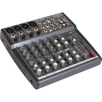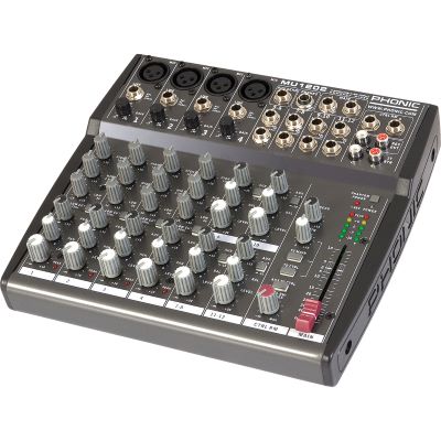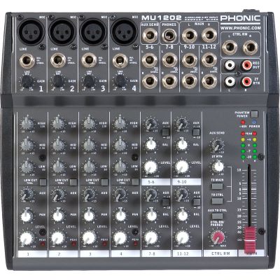 Der MU1202 ist der größere Bruder des MU1002. Neben den hervorragenden Features, die man schon im kleinen MU1002 findet, bietet der MU1202 pro Mikrofonkanal eine Peak Anzeige und 2 Aux Wege, einer pre-fader für Monitoring, der andere post-fader für Effekte.