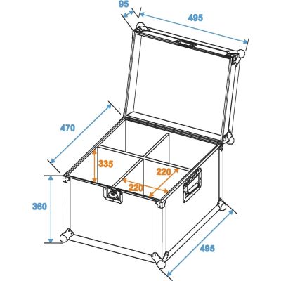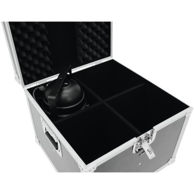 Mit Außenmaßen von 485 x 485 x 425 mm ist das Case kompakt genug für den Transport, bietet aber dennoch ausreichend Raum im Inneren. Die Innenmaße betragen 445 x 445 x 390 mm – genügend Platz für vier PAR-56 Spots, egal ob in der kurzen oder langen Ausführung.