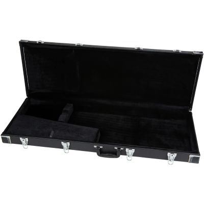 Das Innenfutter aus schwarzem Samt schützt das empfindliche Finish der E-Gitarre vor Kratzern und sorgt gleichzeitig für eine hochwertige Haptik. Besonders praktisch ist das integrierte Zubehörfach mit Deckel, das ausreichend Platz für Plektren, Stimmgeräte, Kabel oder Ersatzsaiten bietet. So bleibt alles Notwendige sicher und ordentlich an einem Ort verstaut.