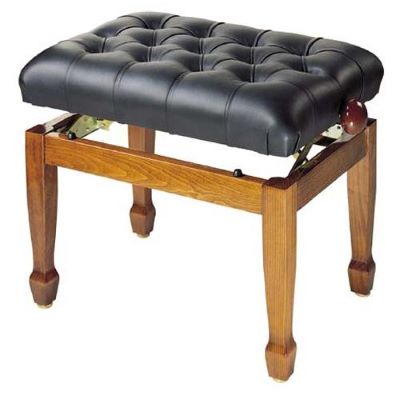 Stilvolle und komfortable Konzert-Klavierbank mit matt lackiertem, walnussfarbenem Gestell und schwarzer Leder-Sitzfläche. Die Bank ist höhenverstellbar und sorgt auch bei sehr langem Klavierspiel für höchsten Sitzkomfort.
