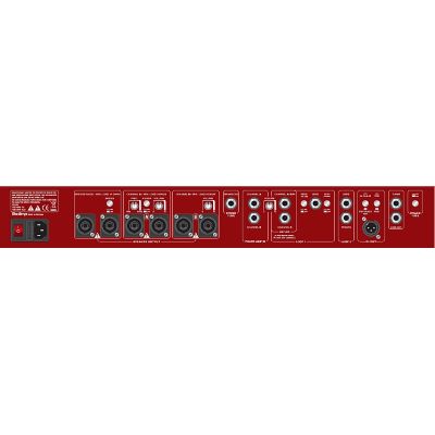 Als besondere Zutat in Punkto Sound erweist sich die zuschaltbare Endstufenröhre vom Typ EL84. Mit ihr kann zu dem Vorstufensound noch das nötige Röhren-Endstufen-Clipping beigemischt werden, um anschließend von der Wucht der 2100 Watt Endstufe in schier unbegrenzte Lautstärke verstärkt zu werden, deren Pegel ebenfalls über ein Magisches Auge angezeigt wird. Um die geballte Power des Bad Bull an die Lautsprecherboxen zu verteilen sind nicht weniger als 6 Speakon Buchsen vorhanden. Zudem ist an Kanal A und B ein zuschaltbares Crossover mit Frequenzregler eingebaut um etwa eine zusätzliche Box als reinen Subwoofer oder ein komplettes Bi-Amping System zu betreiben.