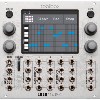The 1010music Toolbox is a sequencer module and function generator, designed for modular synthesizers in Eurorack format. The module provides MIDI and control voltage connections for connection to various types of hardware. The module is controlled via the integrated 3.5" touch screen, which provides access to sequences, parameters and many other events. The screen also provides a complete overview of all active notes and events.