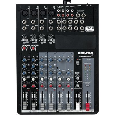 The GIG-104 C Mixing Console is packed with features that cannot be found in other consoles of it's size: 4 mono (provided with ultra low noise microphone pre amplifiers and Phantom Power at +48 Volt ) and 4 stereo input channels. Each of them are provided with a 3-band equalizer for HI, MID and LOW controls, as well as 1 auxiliary control, highly accurate 8-segment bar graph meters and 2-track inputs assignable to main mix, control room/phones or group outputs.