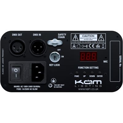 The unique programming and scanning design of Kam XY Laser ensures that this product will not produce a “hotspot” single point laser image. The onboard MSP (Motor Stop Protection) safety cut-out continuously monitors the mirror drivers and is programmed to never allow a persistent laser spot. The MSP device will shut down the laser beam output should any part of the system fail. This circuit, unique to Kam, will change the way laser technology can be used and make future laser shows far more dynamic.