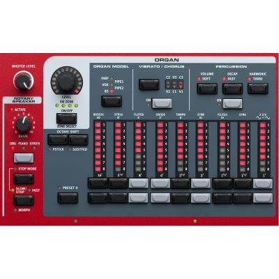 - Rotary speaker: selectable speed (Stop, Slow and Fast) and separate overdrive