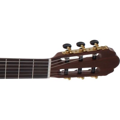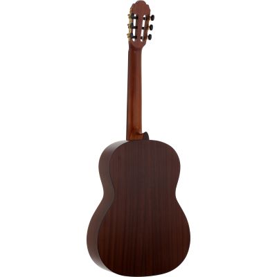 Classic guitar Pro Andalus Model 10 with solid Cedar top and Natural Satin Open-Pore finish. The instrument is equipped with a spanish heel, Rosewood fingerboard, and Mahogany verneered back and sides. The sound is warm and has lightly emphasized basses.